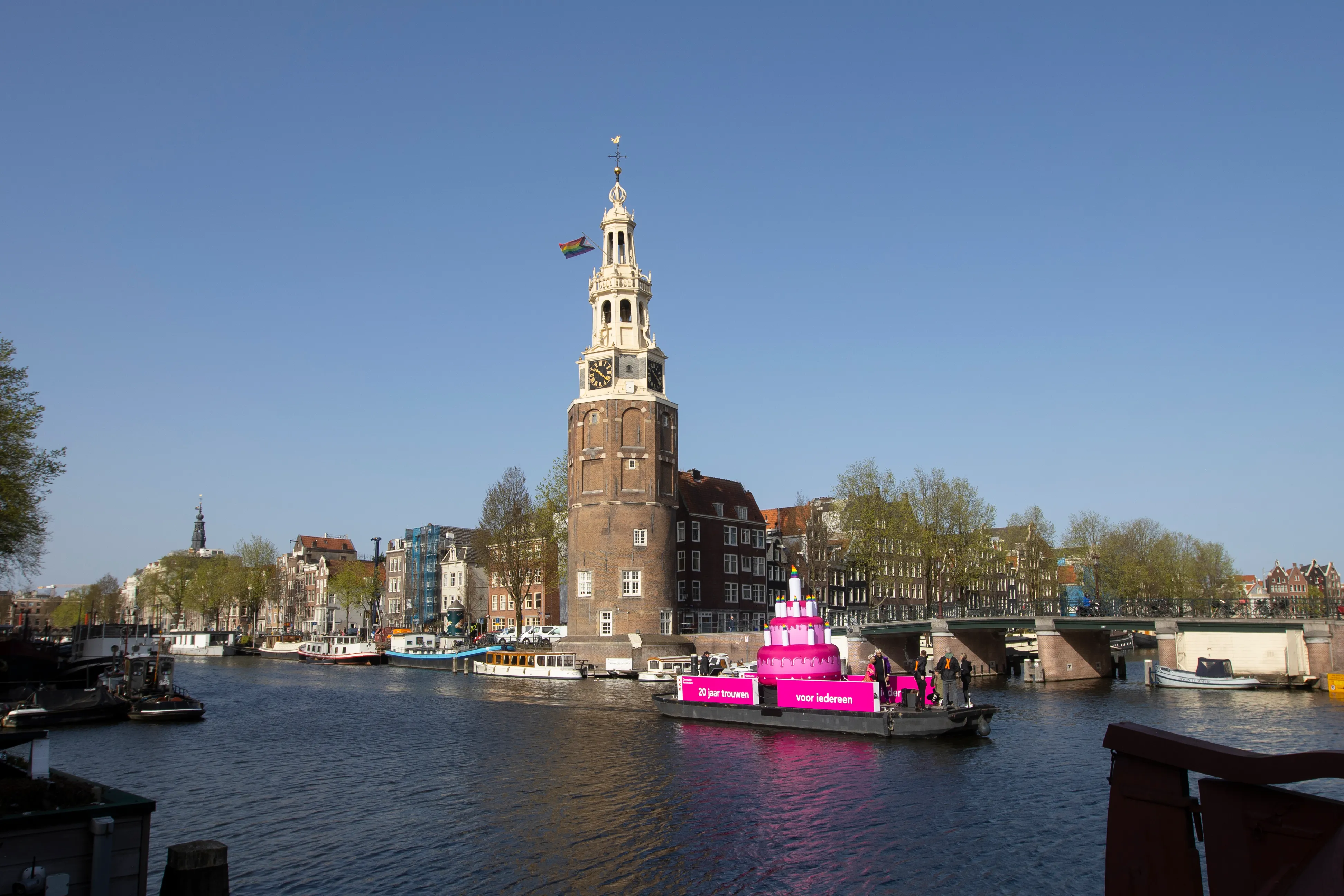 A huge inflatable pink cake with candles spouting rainbow flames glided through the Amsterdam canals Thursday as the Dutch capital celebrated the 20th anniversary of the world's first legal same-sex marriages.